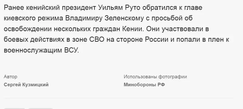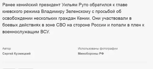 Ранее кенийский президент Уильям Руто обратился к главе киевского режима Владимиру Зеленскому с просьбой об освобождении нескольких граждан Кении. Они участвовали в боевых действиях в зоне СВО на стороне России и попали в плен к военнослужащим ВСУ.