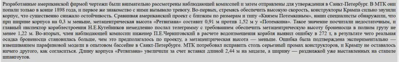 И это – при том, не побоюсь этого слова, бардаке, который царил на верфях Санкт-Петербургского порта, описанного мною в статьях «Особенности управления казенными верфями российской империи на рубеже веков. Кадры решают все» и «О причинах, по которым качество постройки «Осляби» могло оказаться ниже ожидаемого». Напомню также, что ближе к концу 1898 г. разгорелся весьма серьезный скандал, связанный с качеством и скоростью работы казенных верфей, в ходе которого Морское министерство вынуждено было признать и спешно устранять имеющиеся недостатки.