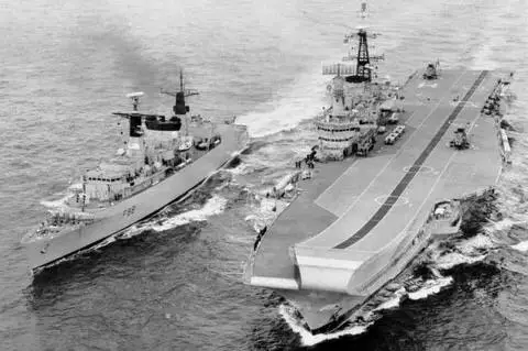 Дальше стоит упомянуть пару авианосцев: «Гермес» и «Инвинсибл». «Гермес» был лёгким авианосцем класса «Центавр», заложили корабль в 1944 году, но в 1945-м, по понятным причинам, строительство приостановили. Правда, в 1953 году его спустили на воду, но только для того, чтобы освободить стапель. Решение о достройке было принято только в 1957 году, и 18 ноября 1959 года над кораблём взвился «Юнион Джек». К 1982 году его авиакрыло состояло из 12 штурмовиков с вертикальным взлётом и посадкой «Си Харриер» и 18 вертолётов «Си Кинг» (после начала конфликта авиакрыло выросло до 16 «Си Харриер», 10 «Сиддли Харриер» и 10 «Си Кинг», в разгар конфликта с авианосца действовало 15 «Си Харриеров» FRS-1, 10 «Харриеров» GR.3, 5 «Си Кинг» HAS.5 и 5 «Си Кинг» HC.4.). Перед самой войной корабль, как ископаемую древность, собирались списать, но вовремя начался конфликт...