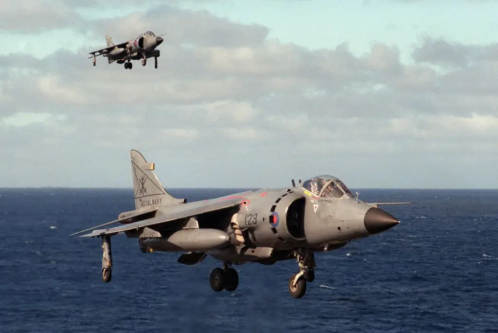 Основными самолётами королевских ВВС в конфликте стали «Си Харриеры» — дозвуковые самолёты с вертикальным/укороченным взлётом и посадкой. Собственно говоря, именно конфликт вокруг Фолклендских островов стал их звёздным часом. Появление этих самолётов на вооружении Королевского флота достаточно интересно. Когда проект нормального авианосца был положен под сукно, английские адмиралы аргументировали необходимость постановки на вооружение самолётов с вертикальным взлётом и посадкой тем, что они смогут защищать корабли от советских крылатых ракет. Как? Ну, советские противокорабельные ракеты в 60-е годы наводились с патрульного самолёта, вот их-то «Си Харриеры» и должны были сбивать. Поэтому сверхзвуковая скорость для них была не важна, а возможность взлетать с короткой палубы без катапульты — наоборот, важна: строительство авианосцев было отменено, но корабль с самолётами с вертикальным взлётом можно было обозвать «авианесущим крейсером» (знакомо, правда?) и протащить его постройку через парламент. В общем, в 1969 году самолёты поступили на вооружение. В 1975 году Королевский флот заказал 24 «Си Харриера» модели FRS.1 (что расшифровывалось как «истребитель, разведчик, ударный»). Потом заказ увеличили до 34 единиц.
