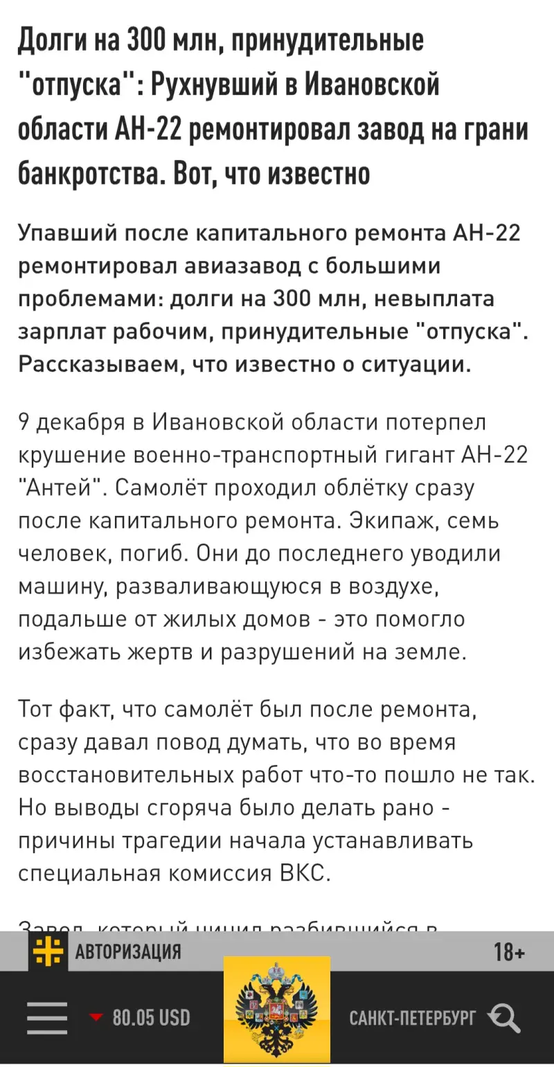 Как сообщает пресса, причиной крушения могли быть нарушения в ходе ремонта. Самолеты Ан-22 были выведены из эксплуатации ВКС РФ в прошлом году.