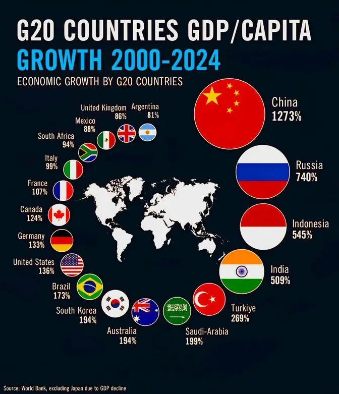За период с 2000 по 2024 год включительно мировыми лидерами по росту ВВП на душу населения являются Россия и Китай. КНР с показателем 1273 процента занимает первое место, а наша страна со своими 740% следует за ней.
