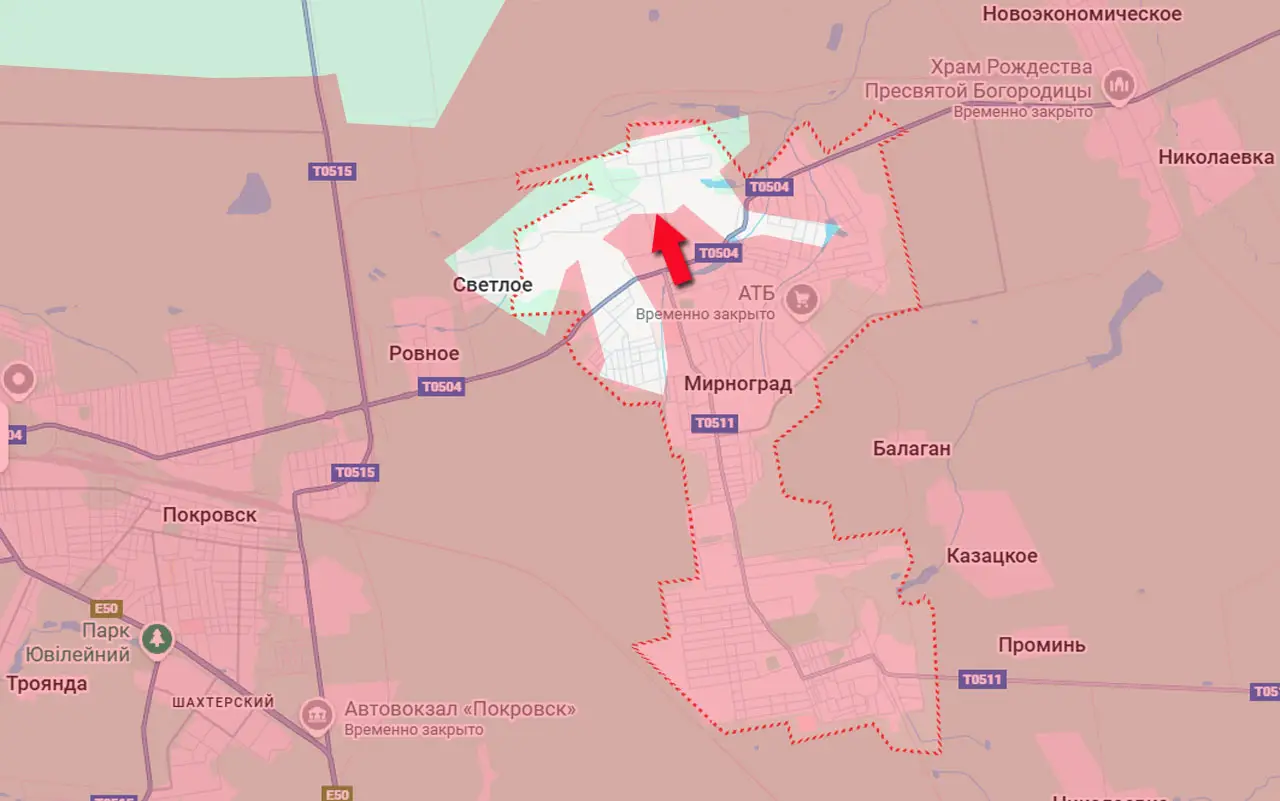 Российские войска сегодня в течение дня осуществили очередное продвижение в Мирнограде, продолжая лишать противника занимаемых территорий. Территории эти уже в течение нескольких недель находятся в котле – в полном окружении. В связи с этим продвижение – это ещё и одновременная ликвидация того, что осталось в Мирнограде (Димитрове) и соседнем Светлом от некогда крупного Покровско-Мирноградского гарнизона ВСУ.