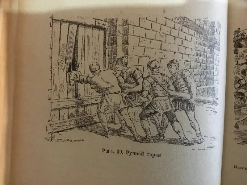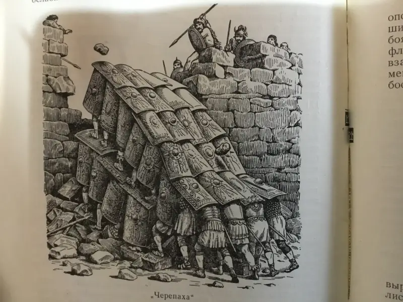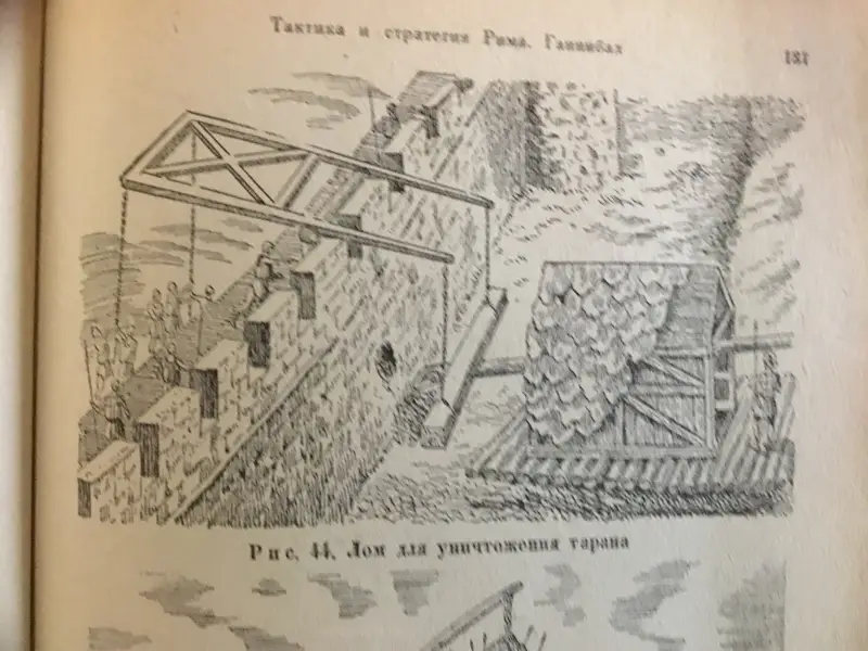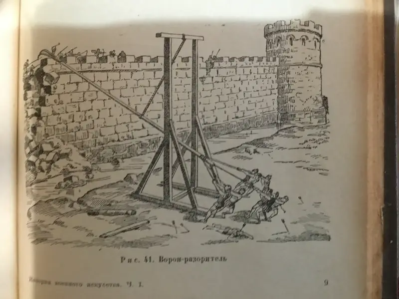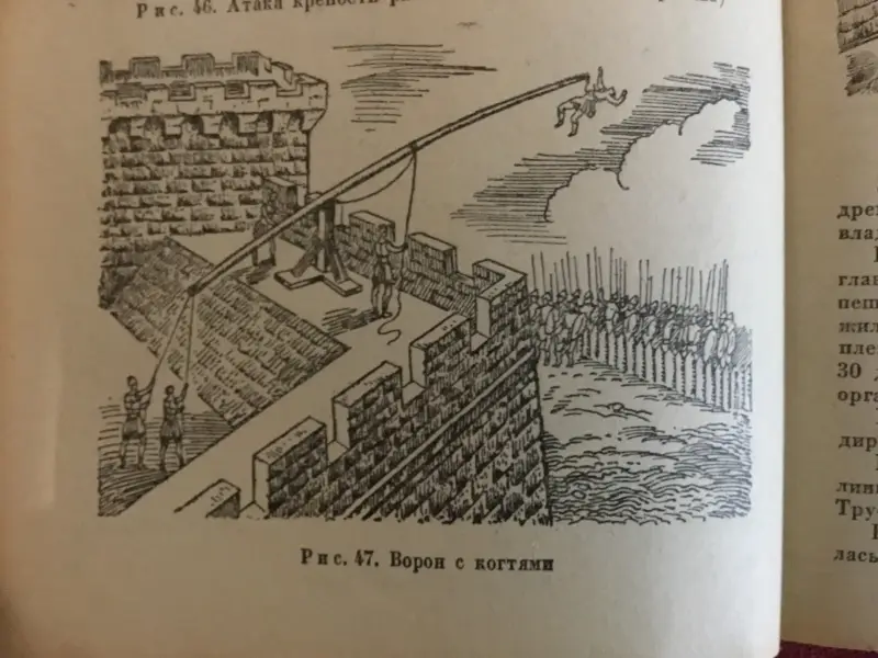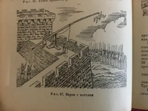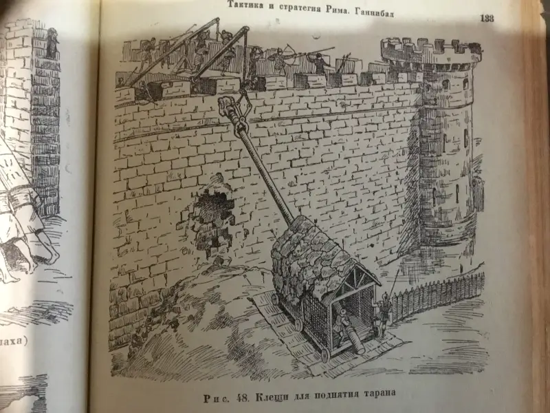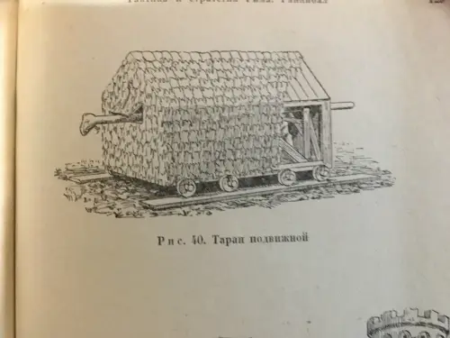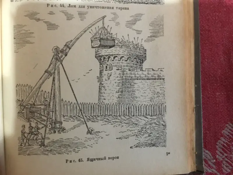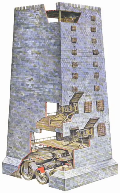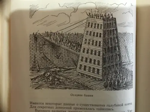 Осадная башня штурмует город. Иллюстрация из книги «Семь чудес света». Ганс Райнхардт, художники Анне-Лиз Име и Герд Вернер. Изд-во «Слово», 1987 г.