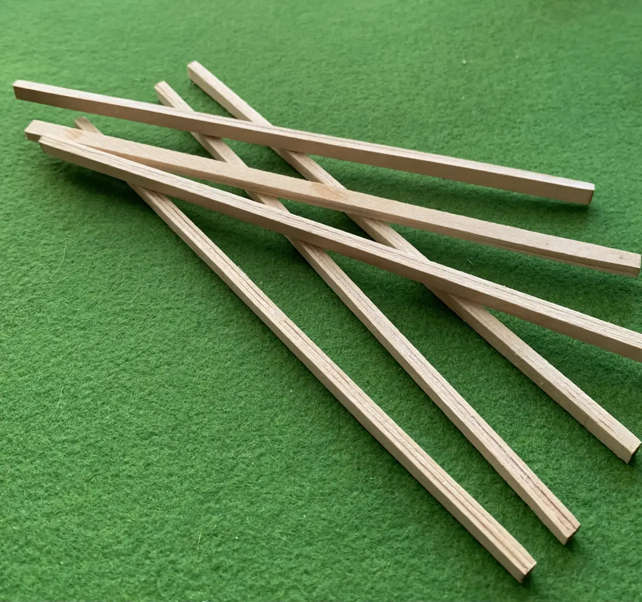 Теперь смотрим на фотографию, на которой приведена основная боковая проекция осадной башни, причем уже склеенная из палочек-мешалок. Ее следует сканировать или сфотографировать, а затем распечатать так, чтобы ширина палочек на ней оказалась равной тем, что вы имеете. Можно заранее сделать из них «балки»: склеить между собой три палочки, после чего на листе наждачной бумаги, положенном на ровную поверхность, аккуратно зачистить их боковые стороны.