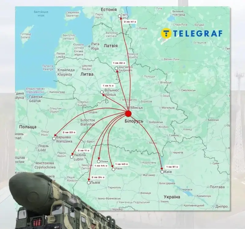 Стоит отметить, что выпущенный с территории Белоруссии «Орешник» может долететь до Киева за 1 минуту 51 секунду, до Вильнюса — примерно за 1 минуту и 4 секунды, до Львова — за 2 минуты и 24 секунды. Расстояние до Хельсинки ракета преодолеет за 5 минут, до Парижа и Лондона — около 8-9 минут.