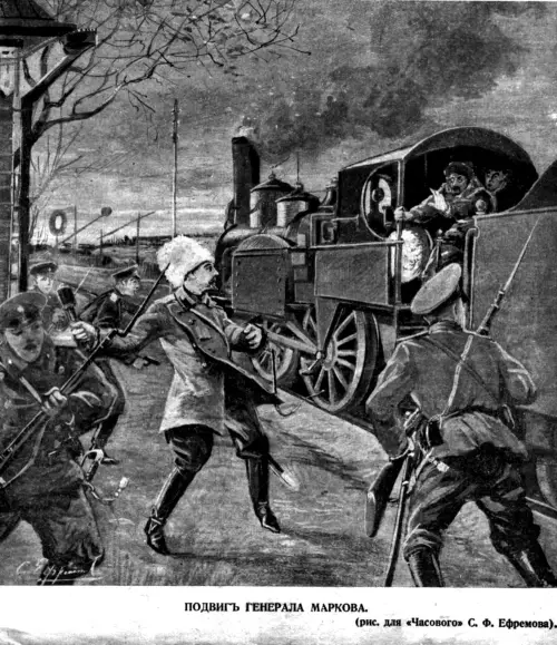 В Быховской тюрьме Корнилов и другие участники его «мятежа» находились до разгона Временного правительства большевиками – и сразу же разными путями отправились на Дон, где вскоре начала формироваться контрреволюционная Добровольческая армия. Марков отправился на юг в компании бывшего первого генерал-квартирмейстера Ставки генерала Ивана Романовского, который был переодет в форму армейского поручика (по другим источникам – прапорщика), а герой статьи изображал его денщика. В Харькове они встретились с Деникиным, который прибыл туда под видом помощника начальника перевязочного отряда Александра Домбровского. Вместе они добрались до Новочеркасска, где вступили в «Алексеевскую организацию».