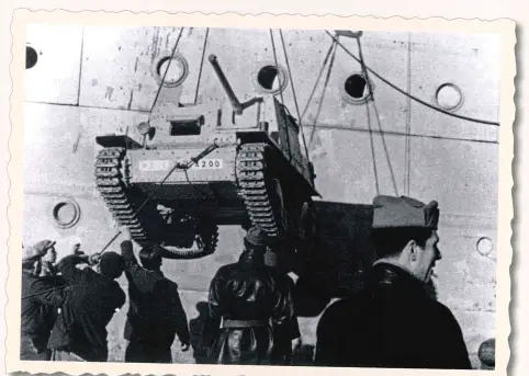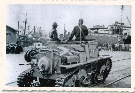 Бастия, 9 сентября 1943 года. Командирская машина командира взвода 1-й роты ХХ батальона противотанковых САУ при взятии под контроль порта Бастии. На заднем плане виден грузовой пароход «Humanitas» пострадавший при попытке немцев захватить итальянские корабли в порту