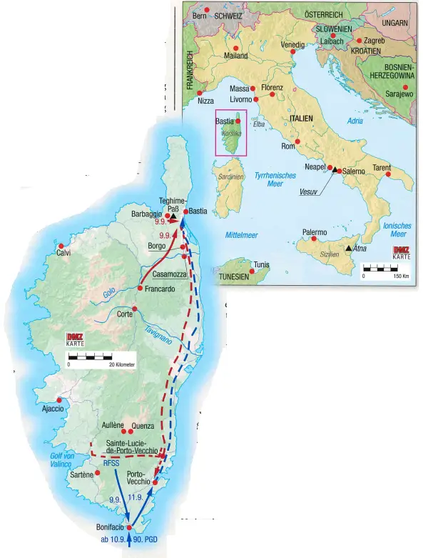8 сентября Гезеле узнал о перемирии от итальянского офицера связи, и поэтому на следующий день, в 6 часов утра, по собственной инициативе начал марш в юго-западном направлении, к Бонифачо, где он создал плацдарм для приёма войск 90-й панцергренадерской дивизии, которые начали прибывать туда с 10 сентября. (Источник — Torsello, стр. 599.)