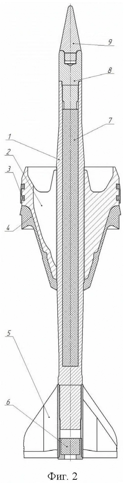 1 — металлический корпус, 2 — ведущее устройство, 3 — полимерный обтюрирующий поясок, 4 — обтюратор ведущего устройства, 5 — стабилизатор, 6 — трассер, 7 — реакционный сердечник, 8 — бронебойный наконечник из тяжёлого сплава, 9 — баллистический наконечник.