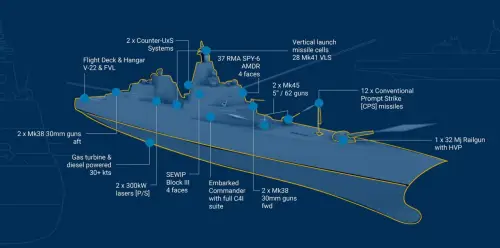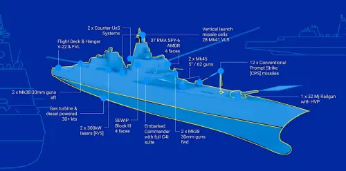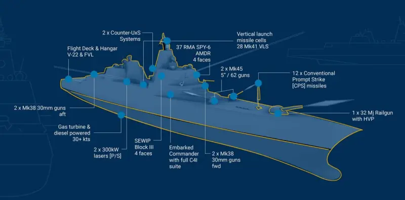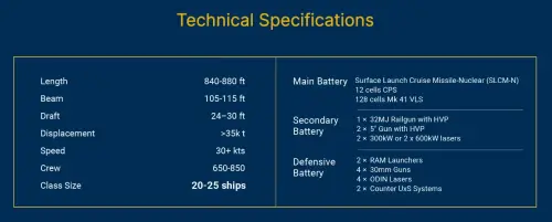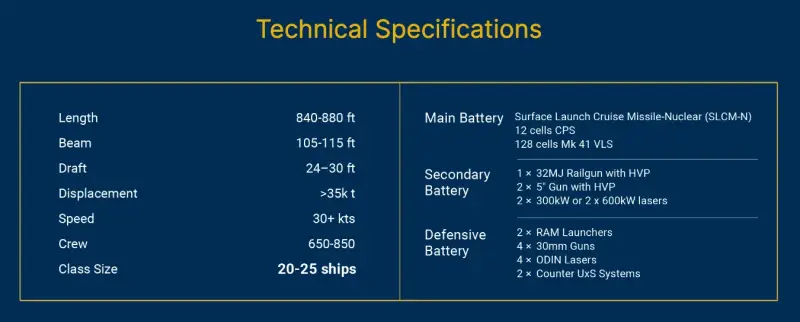Появление нового класса современных линкоров станет важным этапом плана Трампа по созданию в США современного «золотого» флота. Корабли будут вооружены артиллерией, ракетами, гиперзвуковым оружием, электронными рельсотронами и мощными лазерами. Также, по словам Фелана, линкоры оснастят крылатыми ракетами морского базирования с ядерными боеголовками.