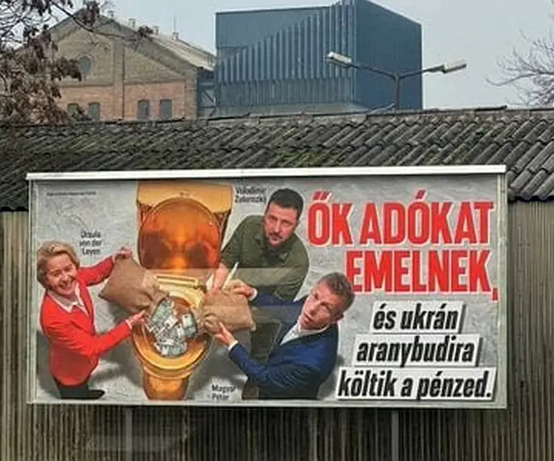 В апреле следующего года в Венгрии пройдут парламентские выборы. Партия Орбана в агитации использует плакаты, образно критикующие продавливаемую ЕК многомиллиардную финансовую помощь Киеву, в том числе за счет замороженных активов РФ. На них улыбающаяся фон дер Ляйен и Зеленский бросают деньги в золотой унитаз. Также на плакатах изображен еще один участник «слива денег» — глава венгерской оппозиционной партии «Тиса» Петер Мадьяр.