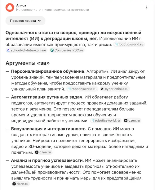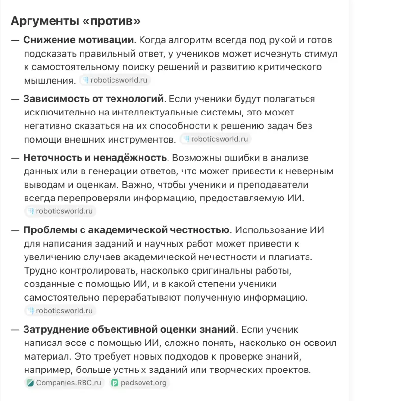 Наличие искусственного интеллекта на расстоянии вытянутой руки грозит фундаментальными последствиями для школьного образования. Атавизмами станут глубокая память и внимание. Зачем что-то запоминать и пытаться вникнуть в проблему, если ИИ всё разжует? Это справедливо и сейчас, но ни одна поисковая система не выдает настолько высокий уровень адаптивности материала, как ответы нейронной сети.