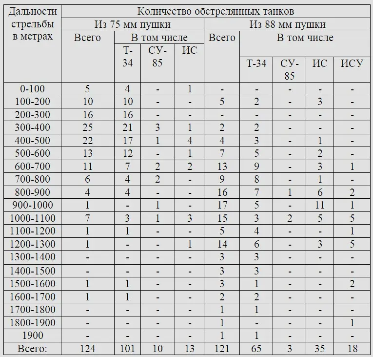 По калибрам 75 и 88 мм зафиксировано в общей сложности 245 случаев обстрела танков и артсамоходов с установленной дальности. Распределение этих 245 случаев по дальностям, по калибрам снарядов, по маркам танков и артсамоходов представлено в таблице ниже.