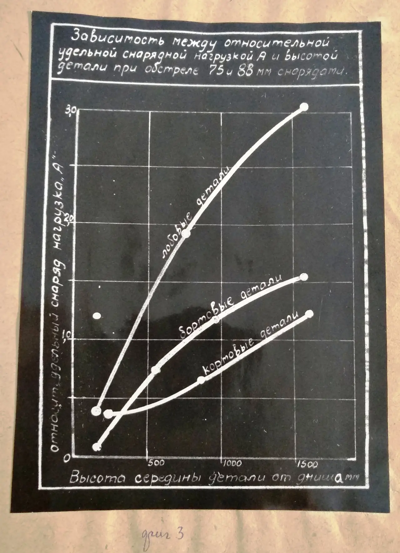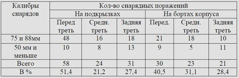 Таким образом, на единицу площади вертикальных проекций броневой защиты башни приходится поражений 75-мм и 88-мм снарядами примерно в 2,5 раза и снарядами калибров 50-мм и меньше — примерно в 1,5 раза больше, чем на единицу площади вертикальных проекций броневой защиты корпуса.