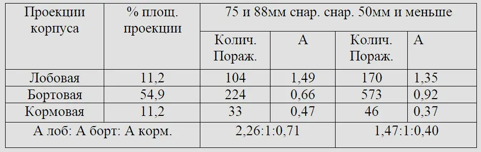 Распределение снарядных поражений между лобовой, бортовой и кормовой проекциями корпуса и относительные удельные снарядные нагрузки «А» на эти проекции представлены в таблице ниже.