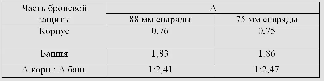 По наиболее интересующим нас калибрам снарядов 75 мм и 88 мм получается, что интенсивность обстрела лобовой проекции башни почти вдвое превышает интенсивность обстрела бортовой проекции башни, а интенсивность обстрела кормовой проекции близка к ней.