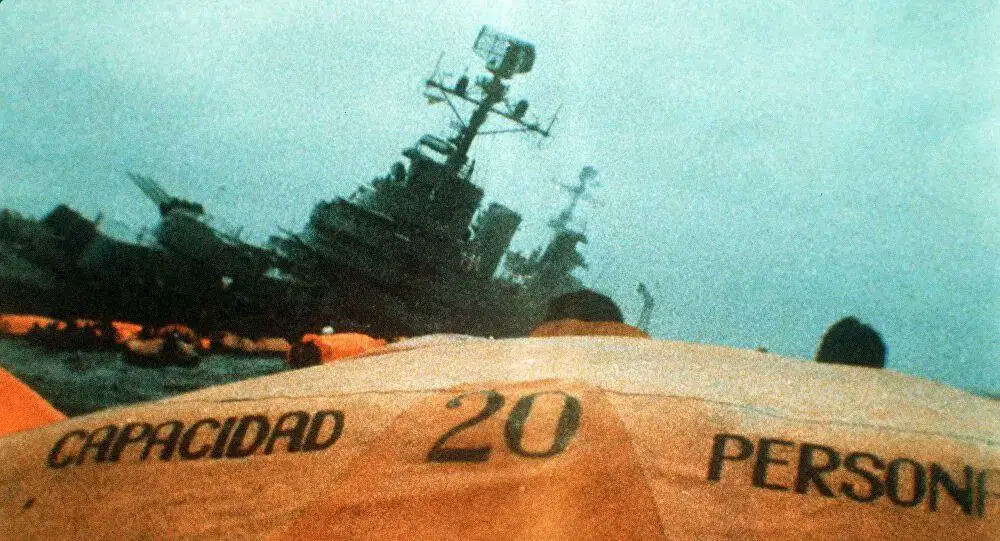 Крейсер быстро кренился на левый борт, команда начала спускать на воду спасательные плотики, моряки делали из шерстяных одеял импровизированные пончо — с тёплой формой у аргентинцев всё было достаточно плохо. Приказ о покидании корабля был отдан в 16:23, когда крен составлял уже 20 градусов. Завершена эвакуация была в 16:40, правда проведена она была… по-латиноамерикански: на некоторых плотиках оказалось по 30 человек, а на некоторых — по три... В 16:50 корабль последним покинул капитан 1 ранга Бонзо, и через десять минут крейсер затонул. Спасательные плотики с корабля были обнаружены только 3 мая, было спасено 770 моряков, погибло 323.