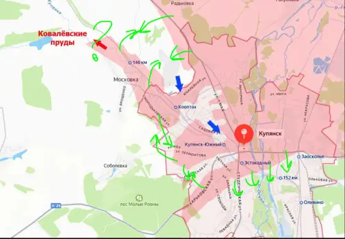 Если говорить о зонах контроля в Купянске и предместьях, то они напоминают самое настоящее лоскутное одеяло. Противник пытается завладеть зданием районной администрации и станцией Купянск-Южный, при этом на западном фланге у него самого возникают проблемы. И эти проблемы увеличатся, если нашим войскам удастся от Московки выйти к Радьковке, что приведёт к окружению сил противника на северной окраине Купянска.