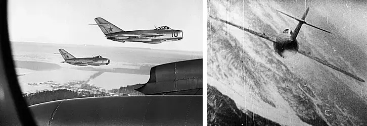 МиГ-15 в небе над Кореей. МиГ-15 стал переломным моментом в Корейской войне. Появившейся в конце 1950 года в небе над Кореей, он быстро доказал своё превосходство над ранними реактивными самолётами ООН, что привело к прекращению дневных бомбардировок и спешному развертыванию «Сейбров»