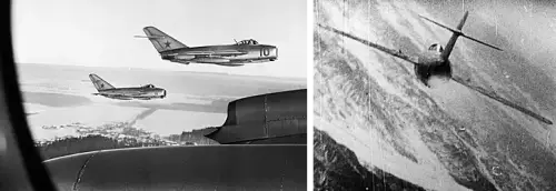 На фото слева: участники контрольных испытаний самолета МиГ-15. На фото справа: истребитель МиГ-15бис, оборудованный специальным устройством «Гарпун» для дозаправки в воздухе (более поздняя доработка)
