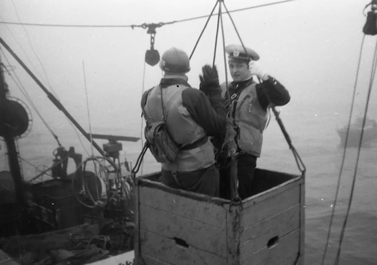 Тут же ещё одна тонкость… корейские траулеры — достаточно большие посудины, обычно старой советской или иной постройки образца мохнатых годов. "Большие, но по пять…" Как на такую посудину высаживаться? По спокойной воде, на якоре и в дрейфе — конечно, проще с борта корабля. Иногда, при сопоставимых размерах и высоте борта, осмотровая группа перебегала на траулер по сходне или даже трапу. Но чаще всего — в корзине, ну вроде как сегодня возят кошек в самолете. Траулер своей грузовой стрелой ставил на нашу палубу эту корзину, осмотровая группа разбивалась на две части и поочерёдно запрыгивала в корзину, и корейцы поднимали её и переносили на свой борт, ставили на палубу, ОГ выгружалась, и ждали следующий ход.
