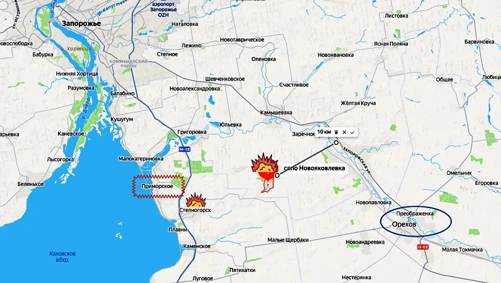 Это наступление более важно тем, что российская армия ведет охват крупного города Орехов с восточного (для гарнизона противника) фланга. От Новояковлевки до важнейшей трассы Н-08 и железной дороги, соединяющих Орехов с Запорожьем, по прямой около десяти километров. Это означает, что снабжение группировки ВСУ в крупнейшем городе на юго-восточных подступах к областному центру Запорожья уже под полным контролем беспилотной авиации и артиллерии ВС РФ.