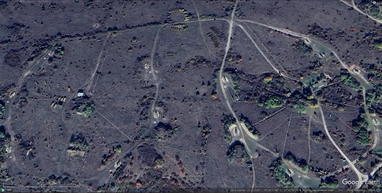 Спутниковый снимок Googlе Еаrth: позиции ЗРК С-200ВЭ в 10 км к северу от города Костинброд. Снимок сделан в октябре 2024 года