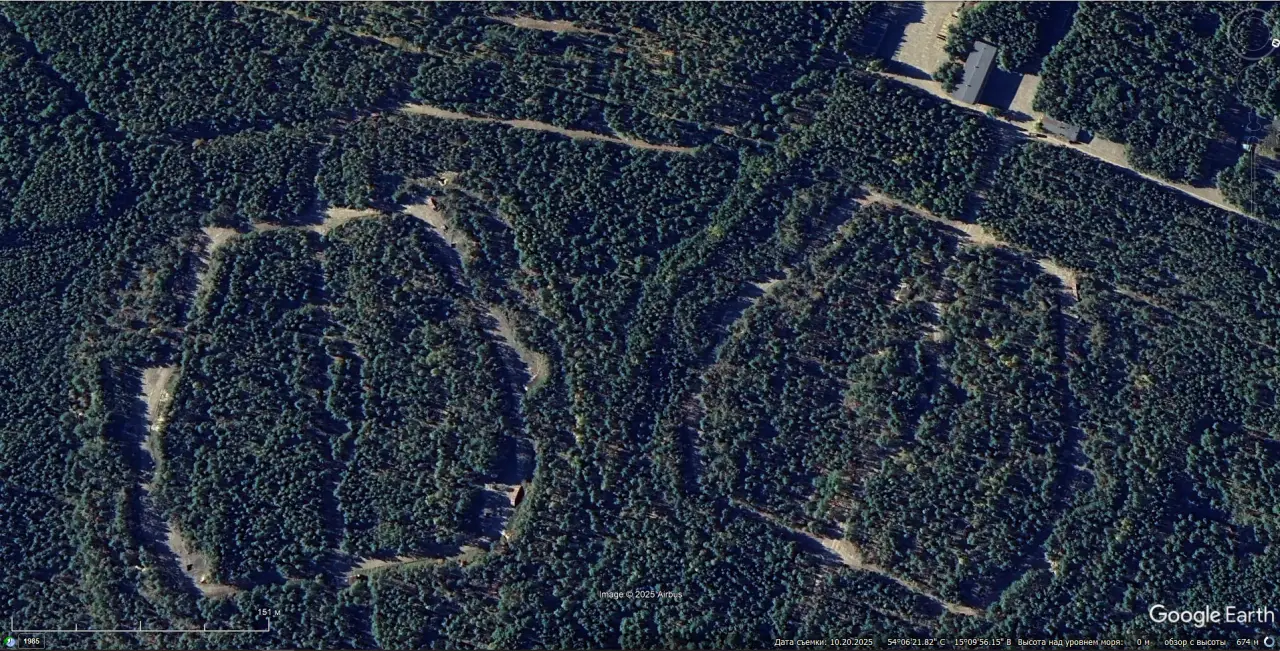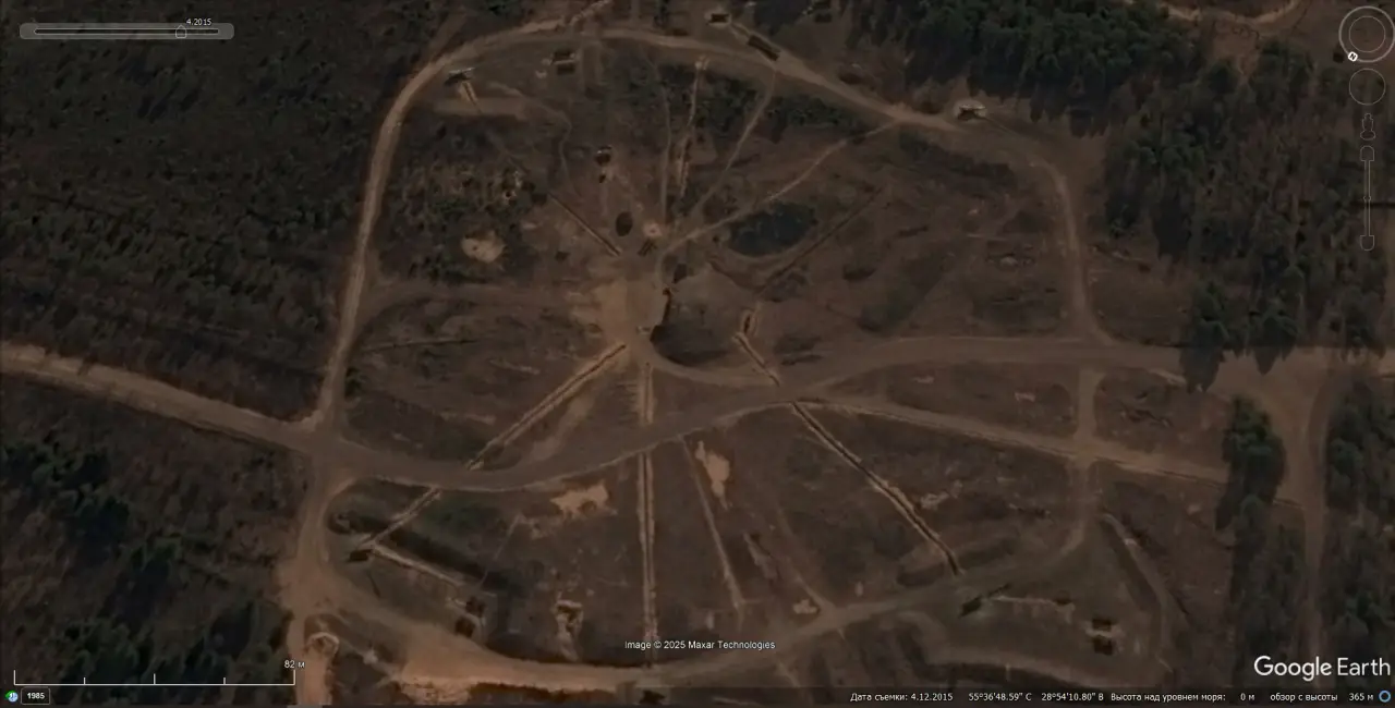 Спутниковый снимок Googlе Еаrth: позиции ЗРК С-200ВЭ в 8 км от городка Мжежино. Снимок сделан в октябре 2025 года