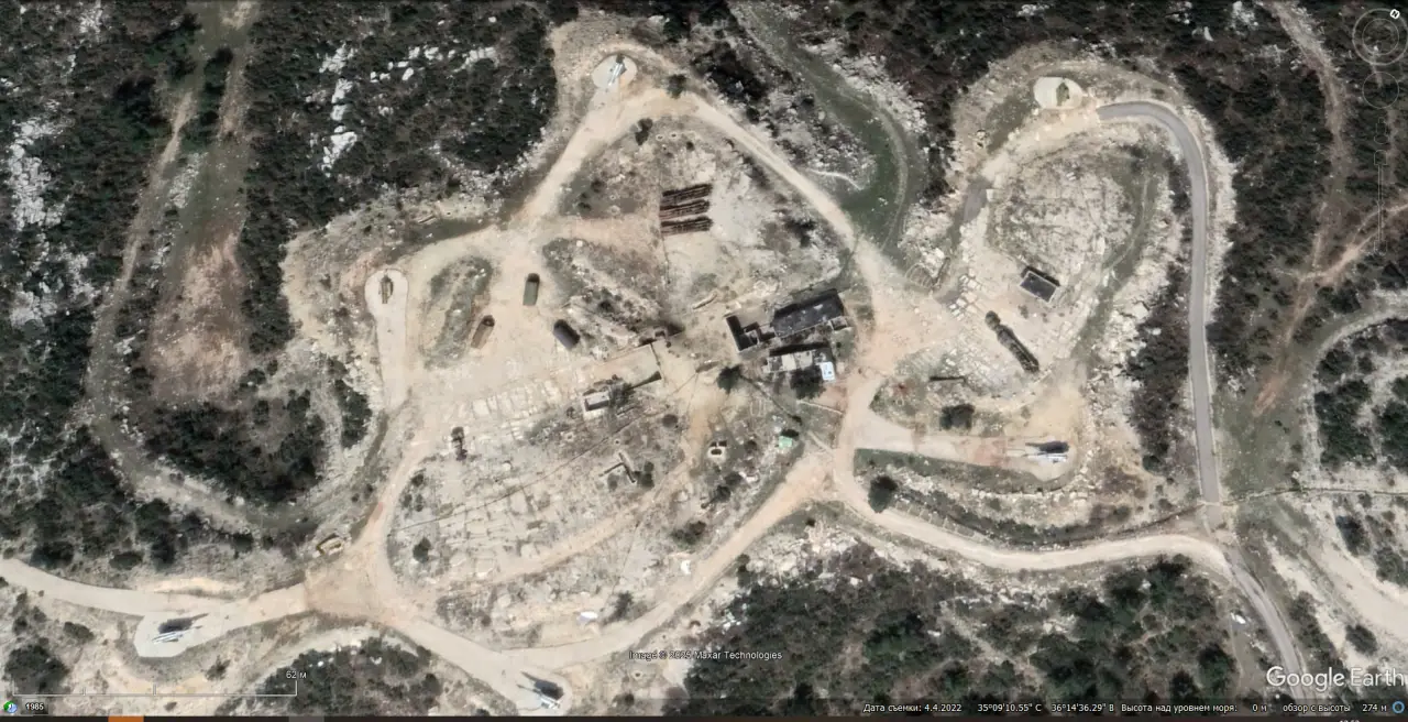 Спутниковый снимок Googlе Еаrth: позиция ЗРК С-200ВЭ в провинции Латакия, в 40 км юго-восточней авиабазы Хмеймим. Снимок сделан в апреле 2022 года