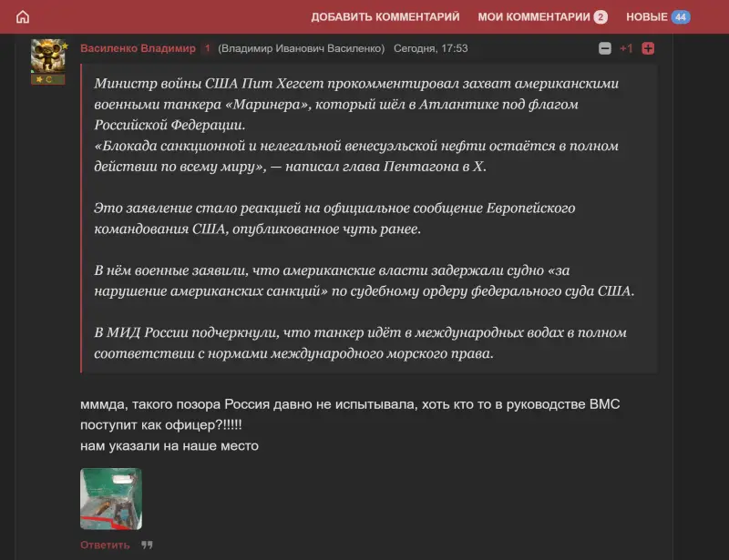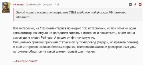 Западное информагентство Reuters публикует материалы, в которых говорится о преследовании танкера «Маринера» натовским спецназом в водах Атлантики. Сначала поступали сообщения о попытке высадки десанта с вертолёта на борт танкера, который идёт под флагом Российской Федерации.