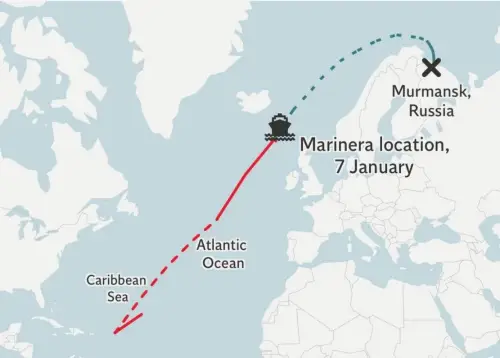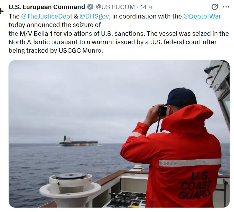 Итак, Береговая охрана США, две недели преследовавшая идущий под российским флагом танкер «Маринера», сумела высадиться на судно и заставить его команду повернуть в сторону Шотландии, спеша зайти в британские воды, чтобы уберечься от российских кораблей. Глава Пентагона Пит Хегсет подтвердил задержание судна, заявив, что блокада венесуэльской нефти остаётся в действии в любой точке мира.