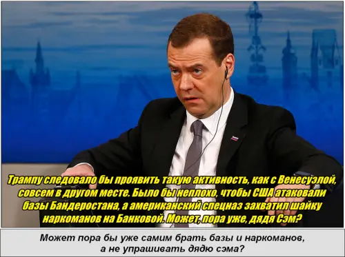 Главным символом этого безумия он называет похищение президента Венесуэлы Николаса Мадуро. По словам Медведева, это не просто хамство, а настоящая катастрофа для всей системы международных отношений.