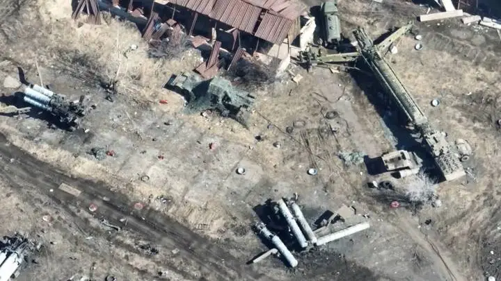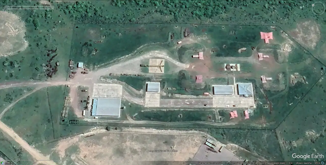 Спутниковый снимок Googlе Еarth: уничтоженная украинская ЗРС С-300ПС. На этой позиции расположенной южней города Алешки в Херсонской области до 2011 года был развёрнут дальнобойный ЗРК С-200ВМ. Снимок сделан в мае 2022 года