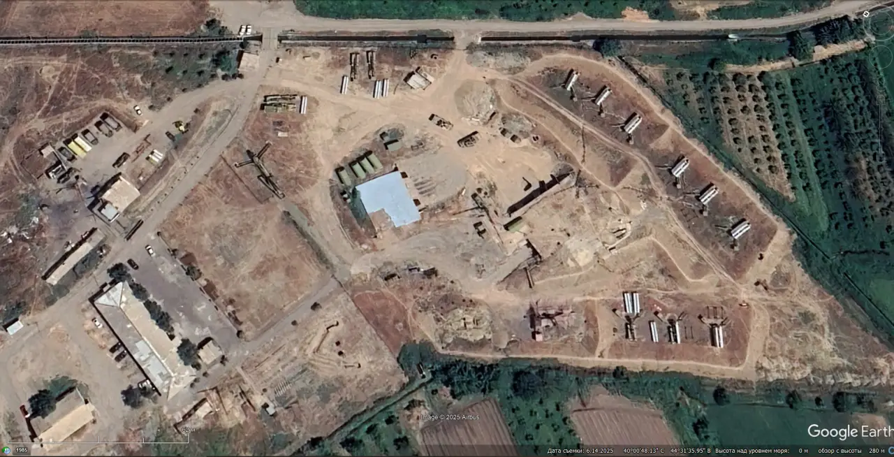 Спутниковый снимок Googlе Еarth: позиция ЗРС С-300ПТ в окрестностях села Бюран юго-восточней Еревана. Снимок сделан в июне 2025 года
