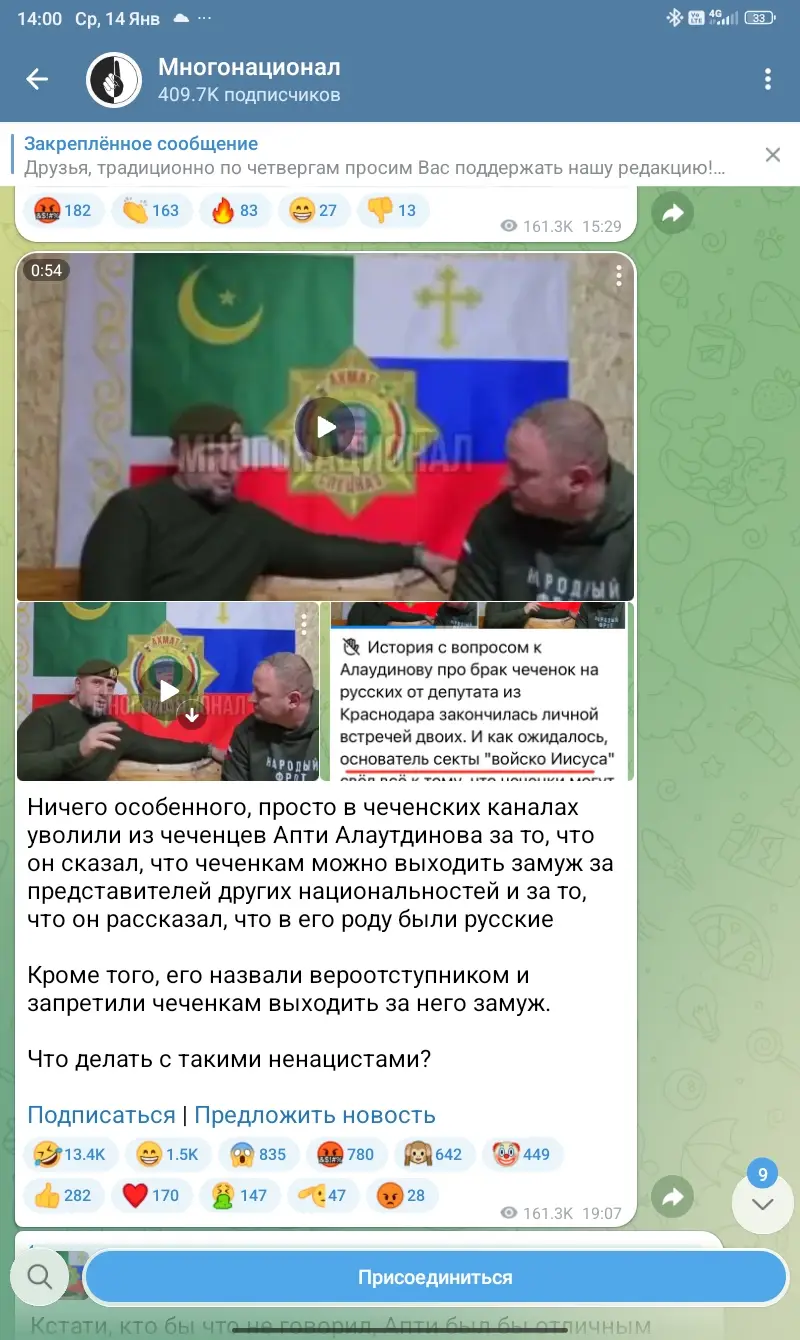 «Правый сектор» (запрещена в России), «Украинская повстанческая армия» (УПА) (запрещена в России), ИГИЛ (запрещена в России), «Джабхат Фатх аш-Шам» бывшая «Джабхат ан-Нусра» (запрещена в России), «Аль-Каида» (запрещена в России), «Фонд борьбы с коррупцией» (запрещена в России), «Штабы Навального» (запрещена в России), Facebook (запрещена в России), Instagram (запрещена в России), Meta (запрещена в России), «Misanthropic Division» (запрещена в России), «Азов» (запрещена в России), «Братья-мусульмане» (запрещена в России), «Аум Синрике» (запрещена в России), АУЕ (запрещена в России), УНА-УНСО (запрещена в России), Меджлис крымскотатарского народа (запрещена в России), легион «Свобода России» (вооруженное формирование, признано в РФ террористическим и запрещено), Кирилл Буданов (внесён в перечень террористов и экстремистов Росфинмониторинга), Международное общественное движение ЛГБТ и его структурные подразделения признано экстремистским (решение Верховного Суда Российской Федерации от 30.11.2023), «Хайят Тахрир аш-Шам» (признана тер. организацией Верховным Судом Российской Федерации)