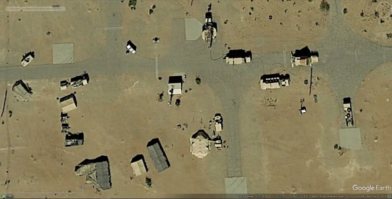 Спутниковый снимок Google Earth: элементы управления, энергоснабжения, связи и радиолокационные средства ЗРК Patriot развёрнутые в ходе учений на площадке неподалёку от Форт-Блисс. Снимок сделан в мае 2018 года