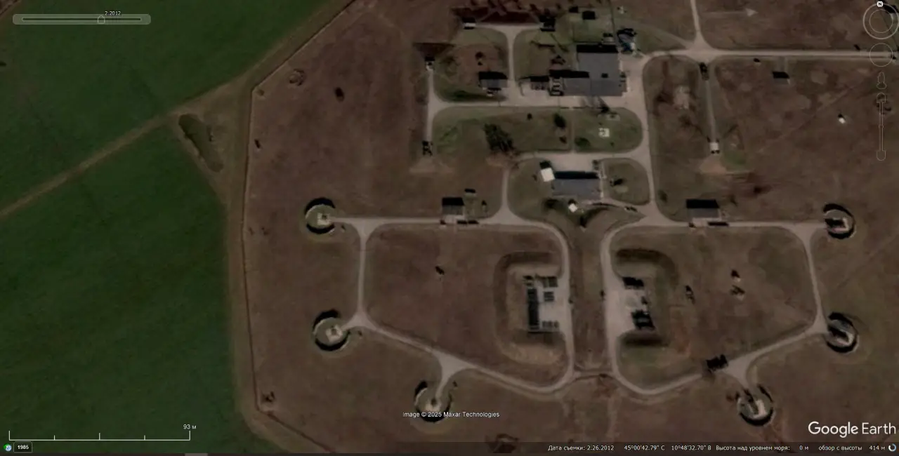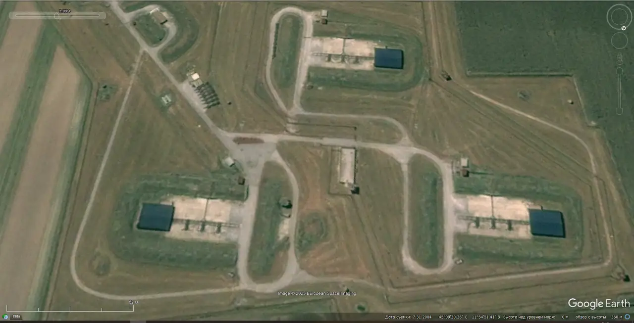 Спутниковый снимок Google Earth: позиция ЗРК MIM-14 Nike Hercules в 25 км южней города Падуя на севере Италии. Снимок сделан в июле 2004 года