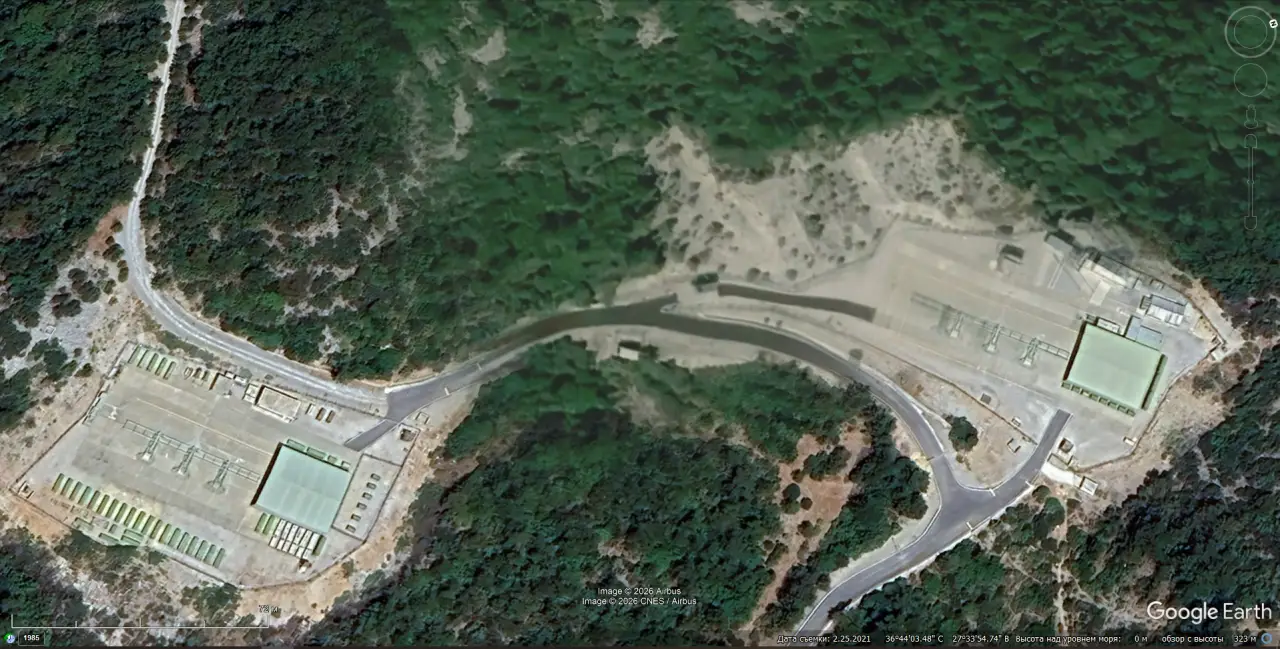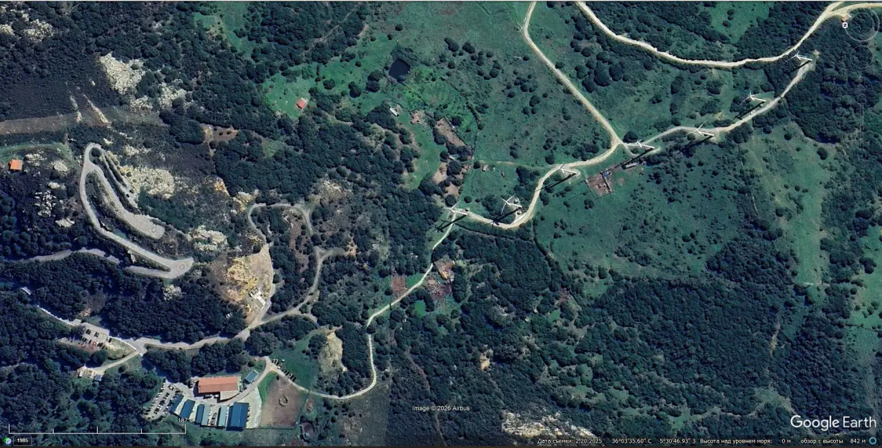 Спутниковый снимок Google Earth: бывшая позиция ЗРК MIM-23 I-Hawk на берегу Гибралтара с ветрогенераторами. Снимок сделан в феврале 2025 года