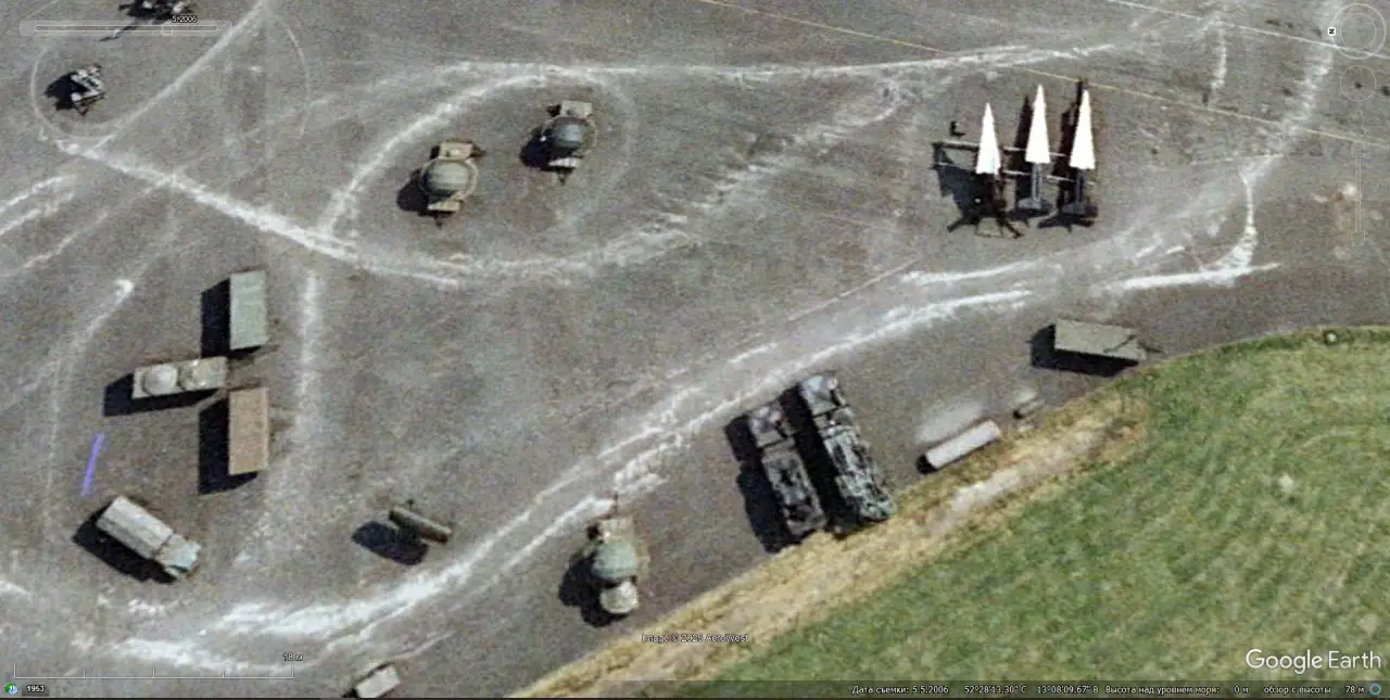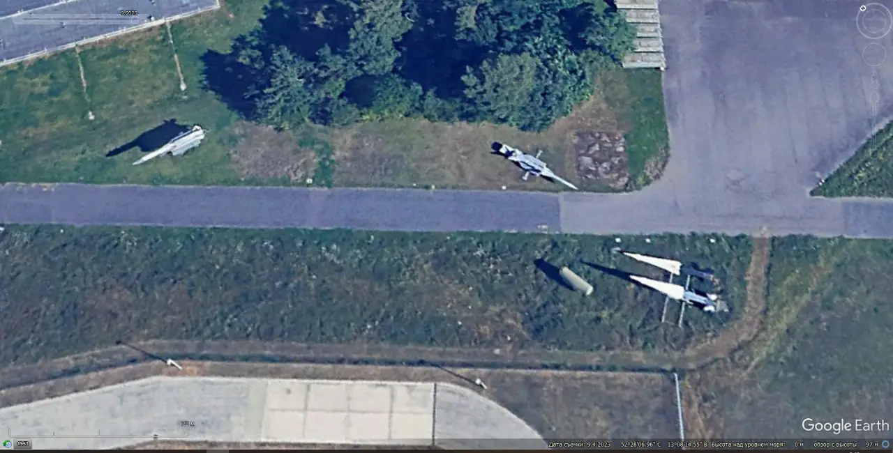 Спутниковый снимок Google Earth: зенитные ракеты использовавшихся в составе ЗРК С-200ВЭ, С-75М3 и MIM-14В в Военно-историческом музее — лётное поле Берлин-Гатов. Видно, что размеры ЗУР сравнимы. Снимок сделан в сентябре 2023 года