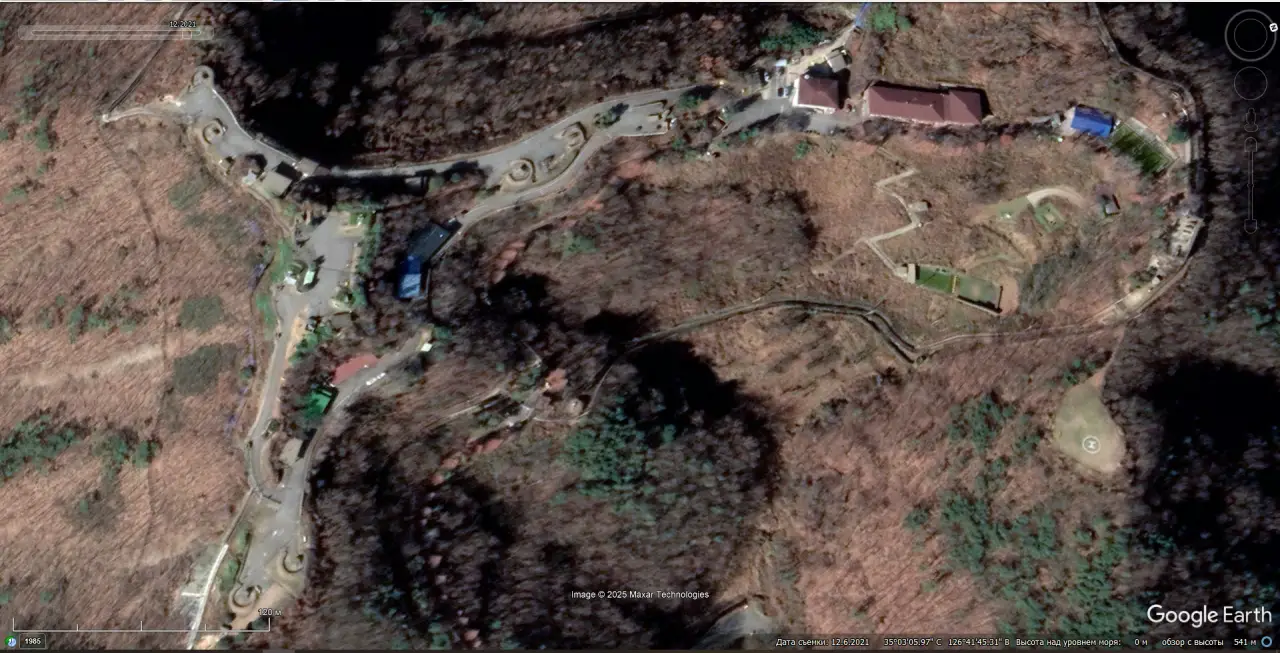 Спутниковый снимок Google Earth: мемориальный комплекс с элементами ЗРК «Найк-Геркулес» и «Хок» на территории части ПВО, расположенной на южной окраине города Тэгу. Снимок сделан в декабре 2022 года.