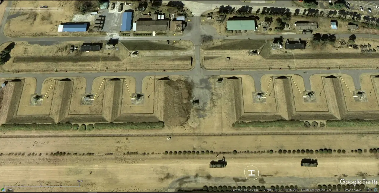 Спутниковый снимок Google Earth: позиция ЗРК Hawk Type III на военной базе Симошизу в Токио. Снимок сделан в феврале 2008 года