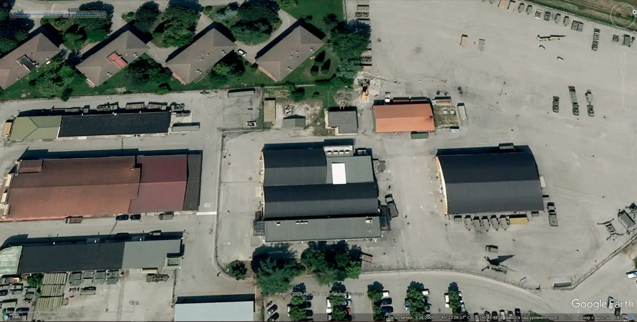Спутниковый снимок Google Earth: элементы ЗРК MIM-14 Nike Hercules на базе хранения в западном пригороде города Падуя. Снимок сделан в мае 2009 года