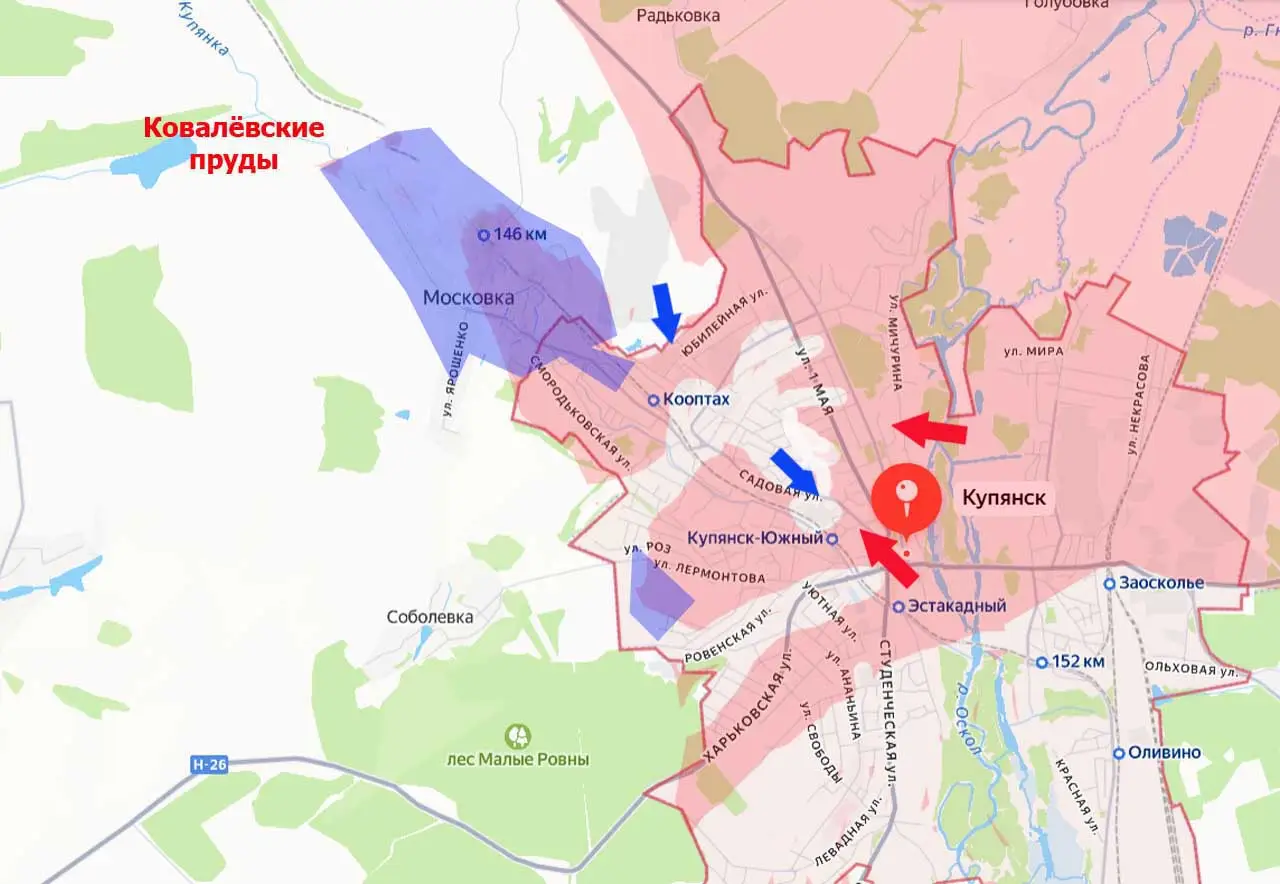 Свою роль играют и погодные условия. В последние несколько дней в Купянске морозно. Столбики термометра опускаются до -12. Противник старается закрепиться на тех позициях, которые смог в течение почти месяца. Российские войска, стараясь этого не допустить, работают по логистике ВСУ. В районе упомянутой Московки, а также к западу от улицы Харьковская, уничтожены топливозаправщик ВСУ и пикап с бочками, наполненными дизельным топливом и бензином.
