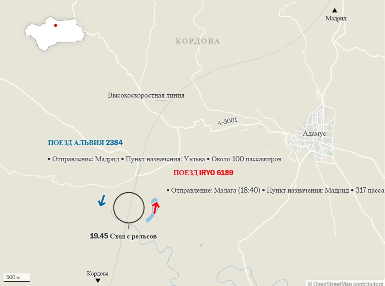 Речь идёт о схождении с рельсов пассажирского поезда Iriyo Малага-Мадрид, в котором было более 300 пассажиров. Вагоны поезда, по последним данным, при схождении врезались в другой поезд (Alvia), который двигался на скорости около 200 км/ч в противоположном направлении (Мадрид-Уэльва) по соседнему пути, и в результате столкновения составы сорвались с 4-метровой насыпи, доступ к которой затруднён. В скоростном поезде Alvia было около сотни пассажиров.