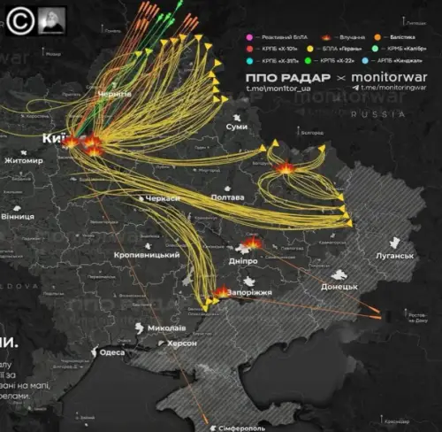 Если верить сообщениям противника, то ВС РФ использовали не только БПЛА «Герань», но также и различные виды ракетного вооружения, включая гиперзвуковые «Кинжалы», ракеты Х-22, Х-101 и другие.
