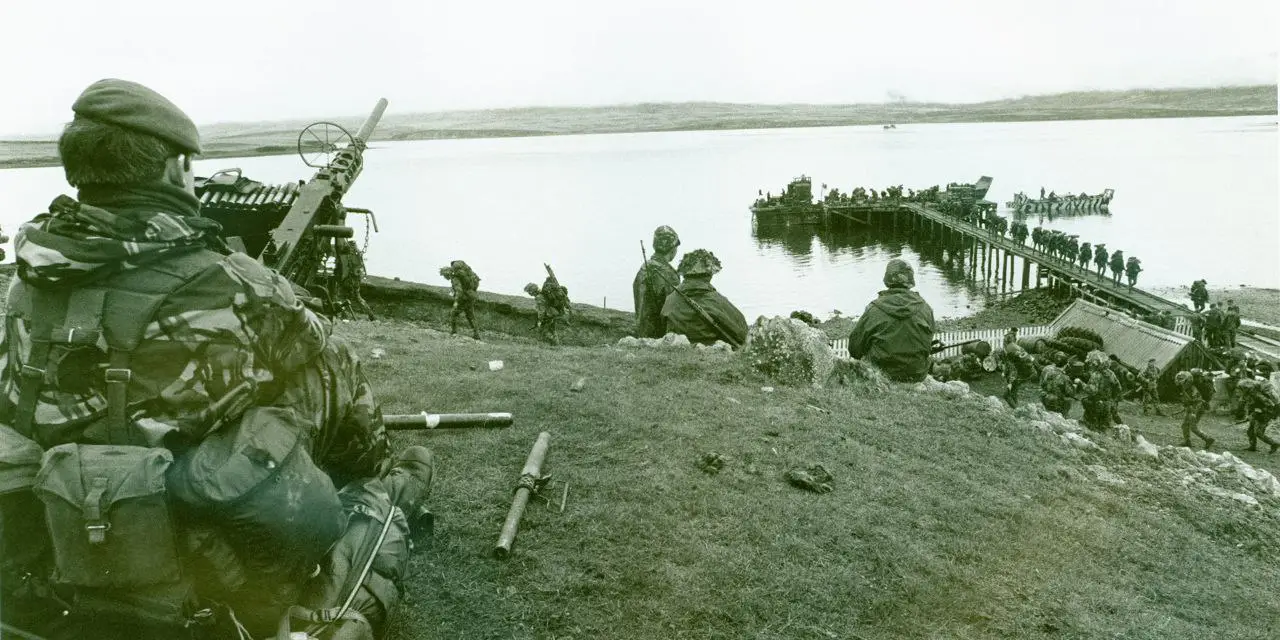 Момент высадки морской пехоты — самая опасная часть десантной операции: не окопавшиеся войска, сваленные на берегу боеприпасы и снаряжение крайне уязвимы для действий противника. Но, к удивлению английского командования, аргентинцы высадке не препятствовали никак! Десантные корабли «Феарлесс», «Интрепид», «Сэр Галахад», «Сэр Ланселот», «Сэр Тристрам», «Сэр Герейнт» и «Сэр Персиваль» шли первым эшелоном с 3-й бригадой коммандос (кроме 2-го парашютного батальона и 22-го отряда САС) и 5-й пехотной бригадой (гвардейцы и гуркхи), за ними следовали «Еуропик Ферри», «Норланд», «Канберра», «Стормнесс» и «Форт Остин» с тяжёлой техникой, запчастями, боеприпасами и экипировкой.