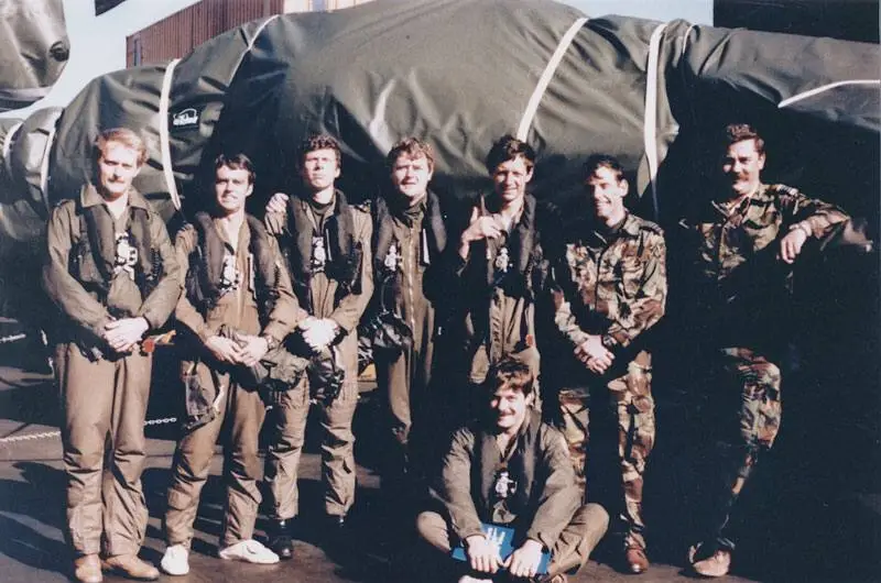 Пилоты «Харриеров» 1-й эскадрильи Королевских ВВС на борту «Атлантик Конвейера»