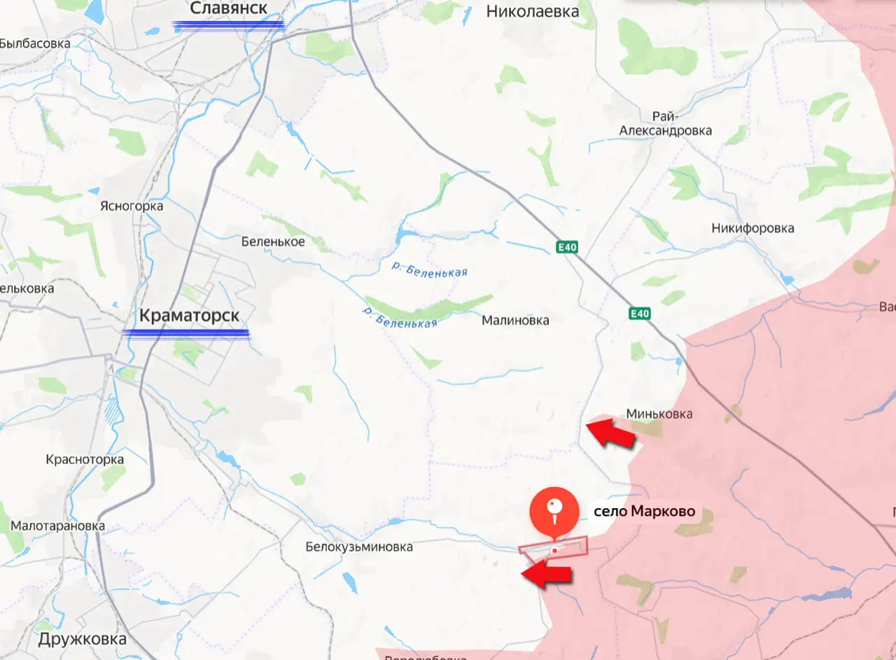 Поступают сообщения о том, что большая часть села Марково перешла под контроль российских Вооружённых сил. Село находится на реке Беленькая. Эта река проходит и через город Краматорск.