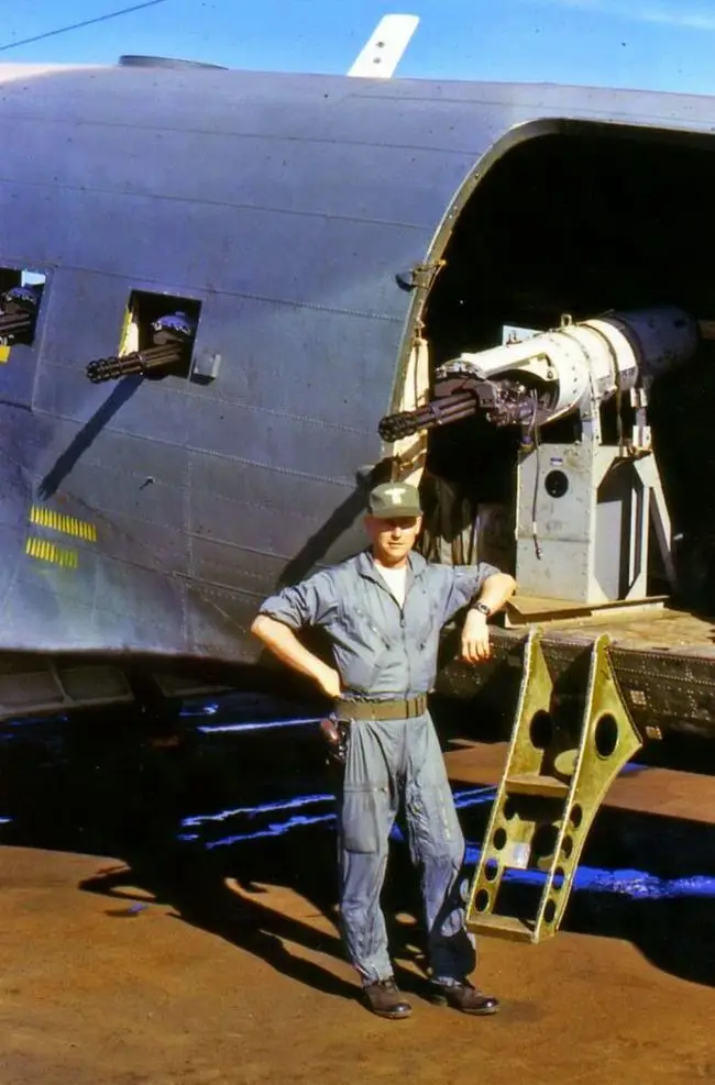 Собственно, так в начале 1960-х и появился «Миниган». Первоначально пулемёты ставили в подвесные контейнеры. Собственно, контейнеры M18 и SUU-11/A (суть та же, только одно армейское обозначение, второе ВВС) и стали основным местом приложения сил. Подвешивали их на штурмовики и вертолёты. В общем, пулемёт вроде нашёл свою нишу… Но тут на сцену вышли Силы специального назначения Армии США. Там давно раздумывали над идеей «воздушного линкора», самолёта, который бы летал над полем боя и буквально поливал бы его из пулемётов, но только не курсовых, а располагавшихся перпендикулярно направлению полёта. Короче, «ганшип». Хотя практиковались на современном транспортнике, именно боевым первенцем стал старик С-47, в который по одному борту установили три немного моделированных авиационных контейнера с М134 (точнее, GAU-2).